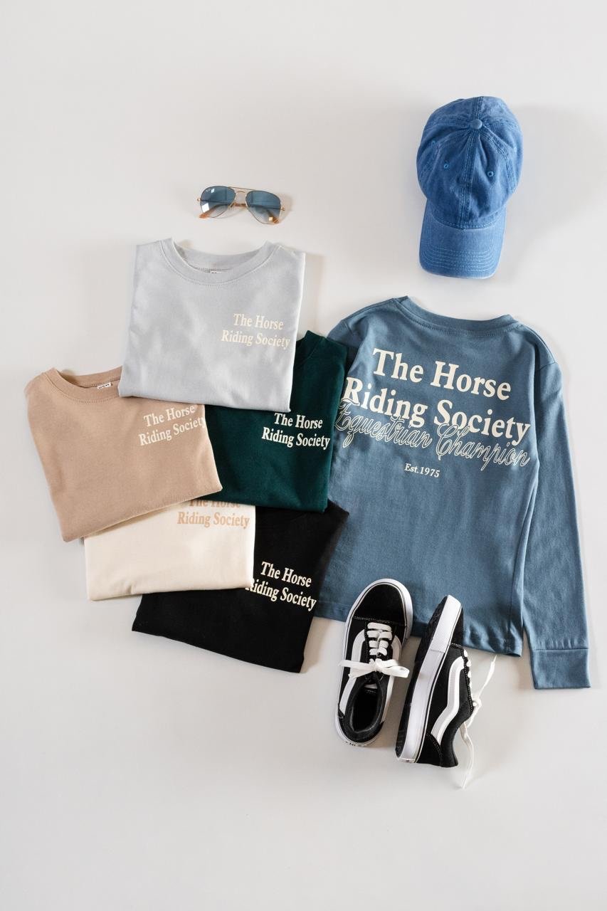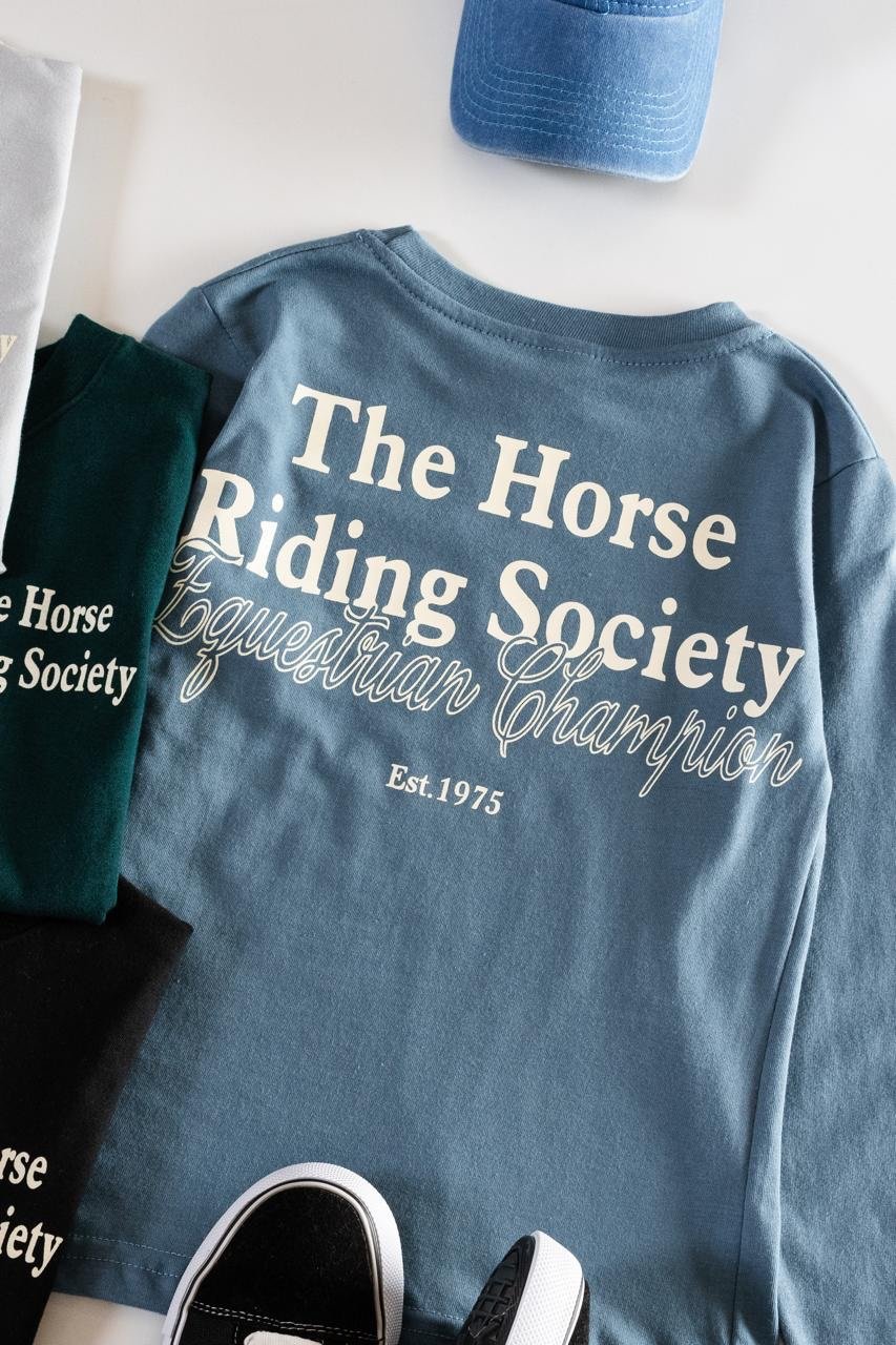 Remera de manga larga para niño confeccionada en algodón suave y confortable. Presenta estampa frontal pequeña “The Horse Riding Society” y estampa grande en la espalda con diseño tipográfico que le aporta un estilo moderno y deportivo.