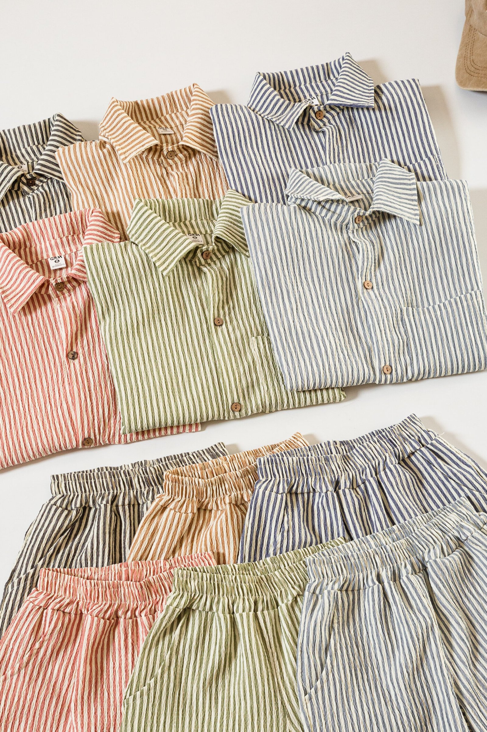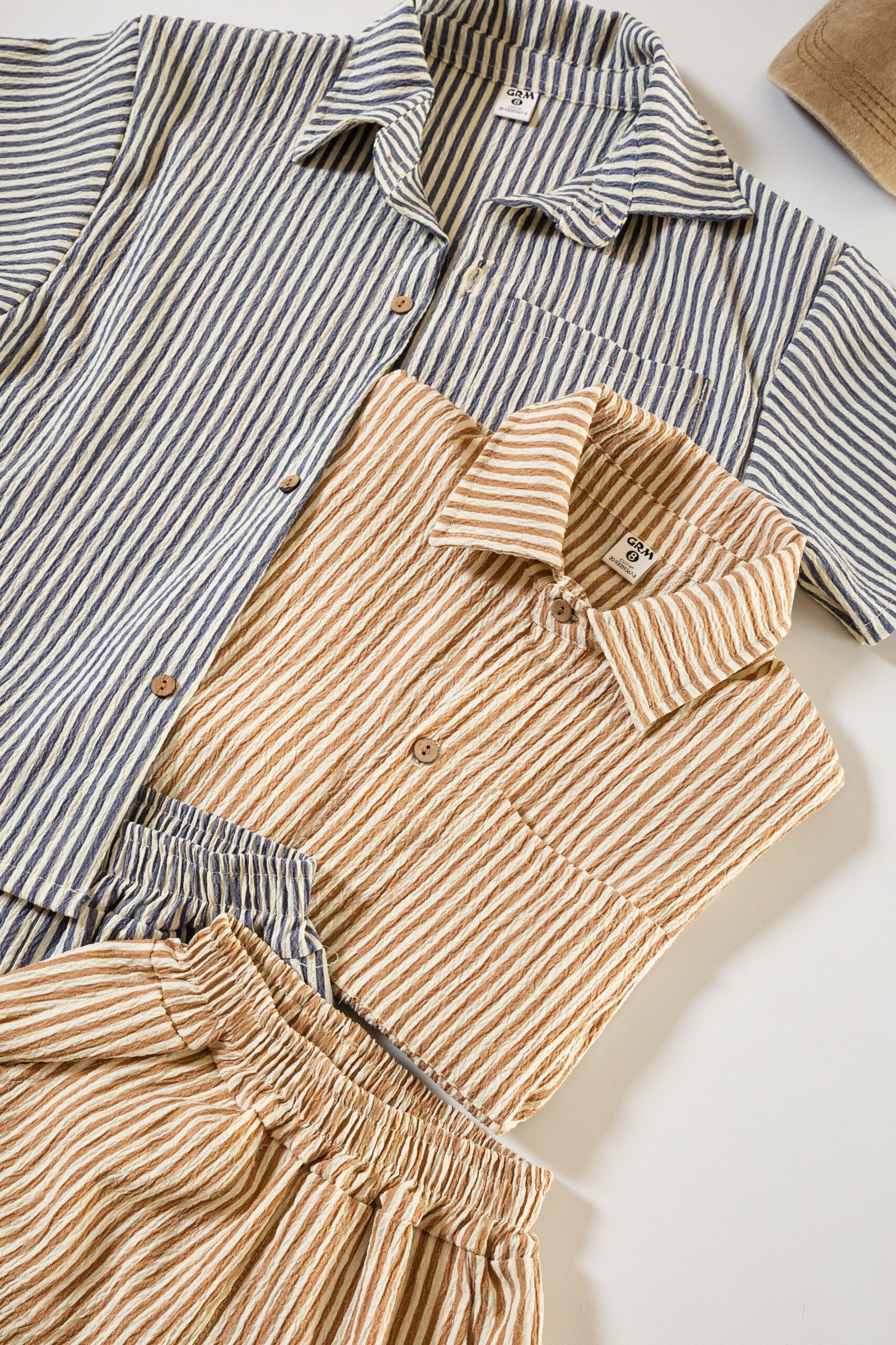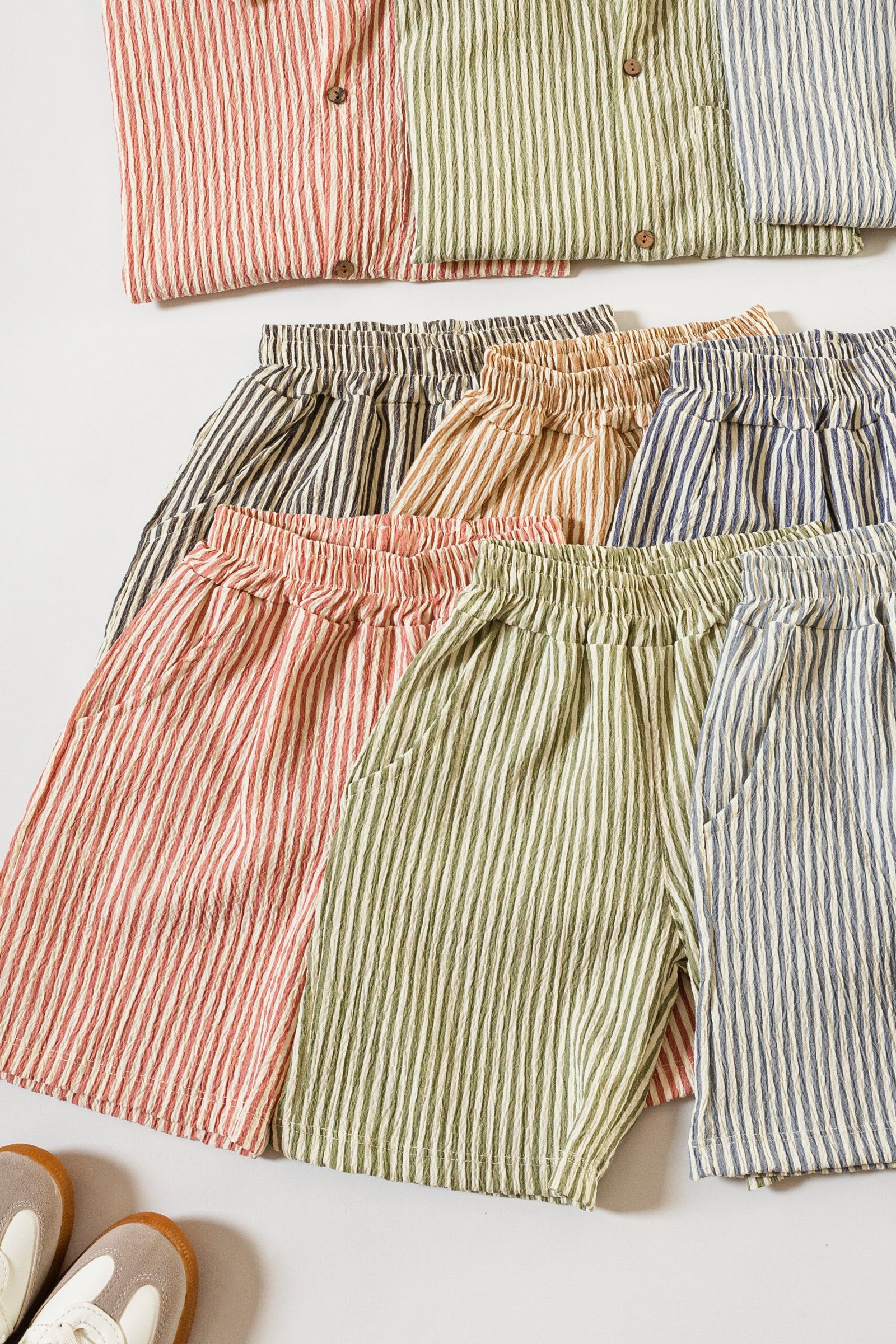 Conjunto de camisa oversize y short clásico, confeccionado en tela Bruselas estampada con diseño rayado. Una propuesta liviana, fresca y cómoda, ideal para los días de verano.