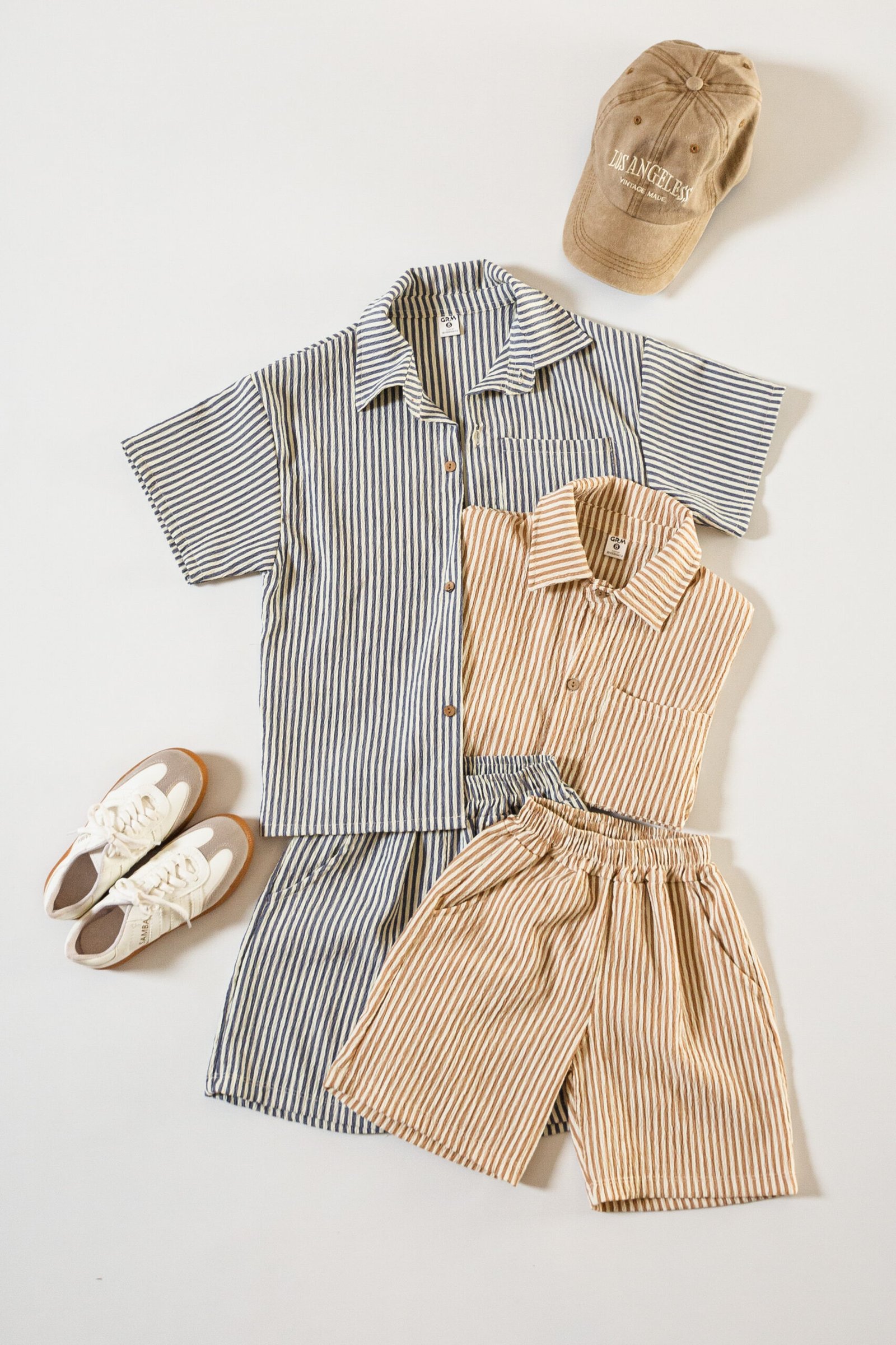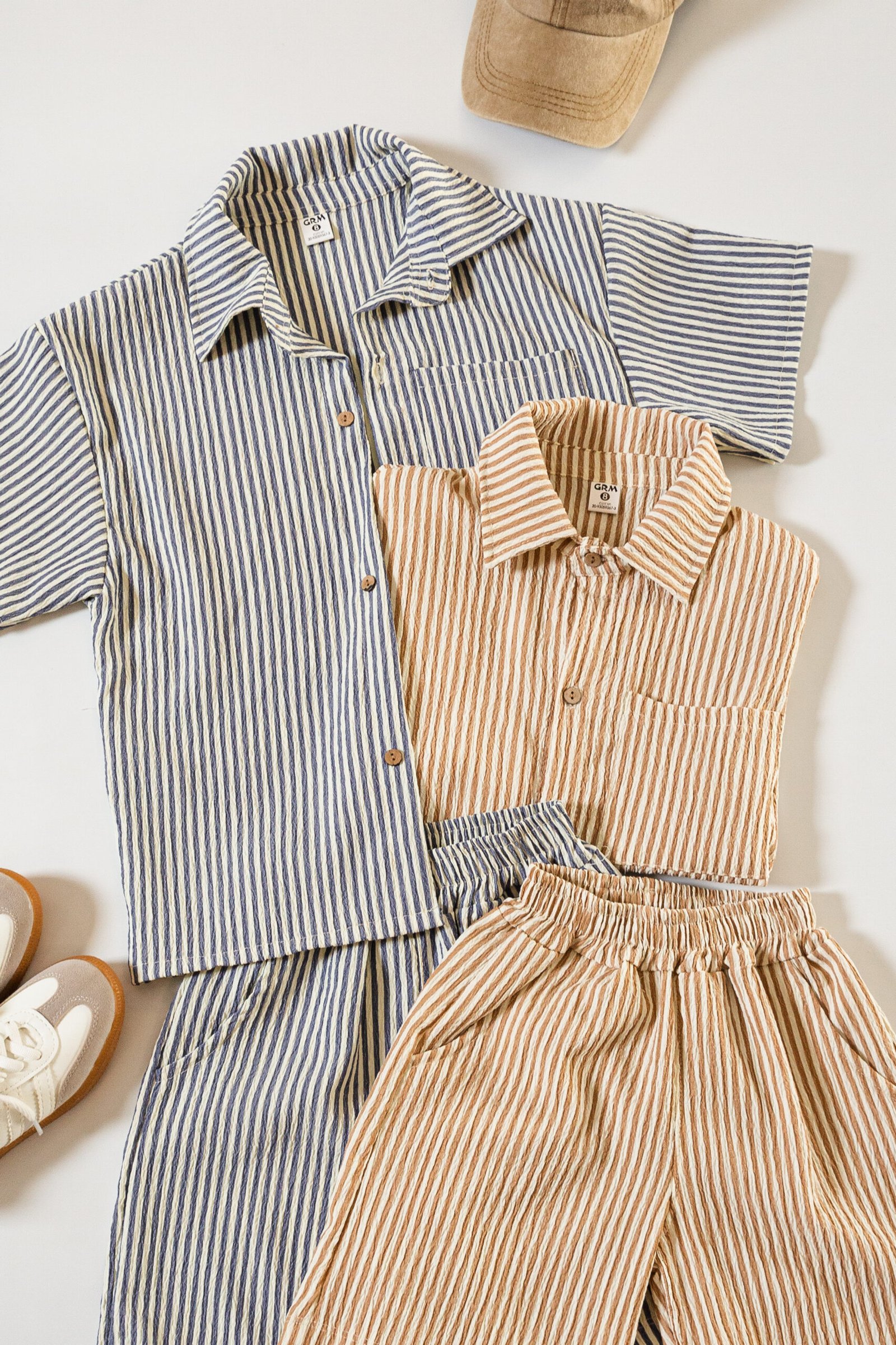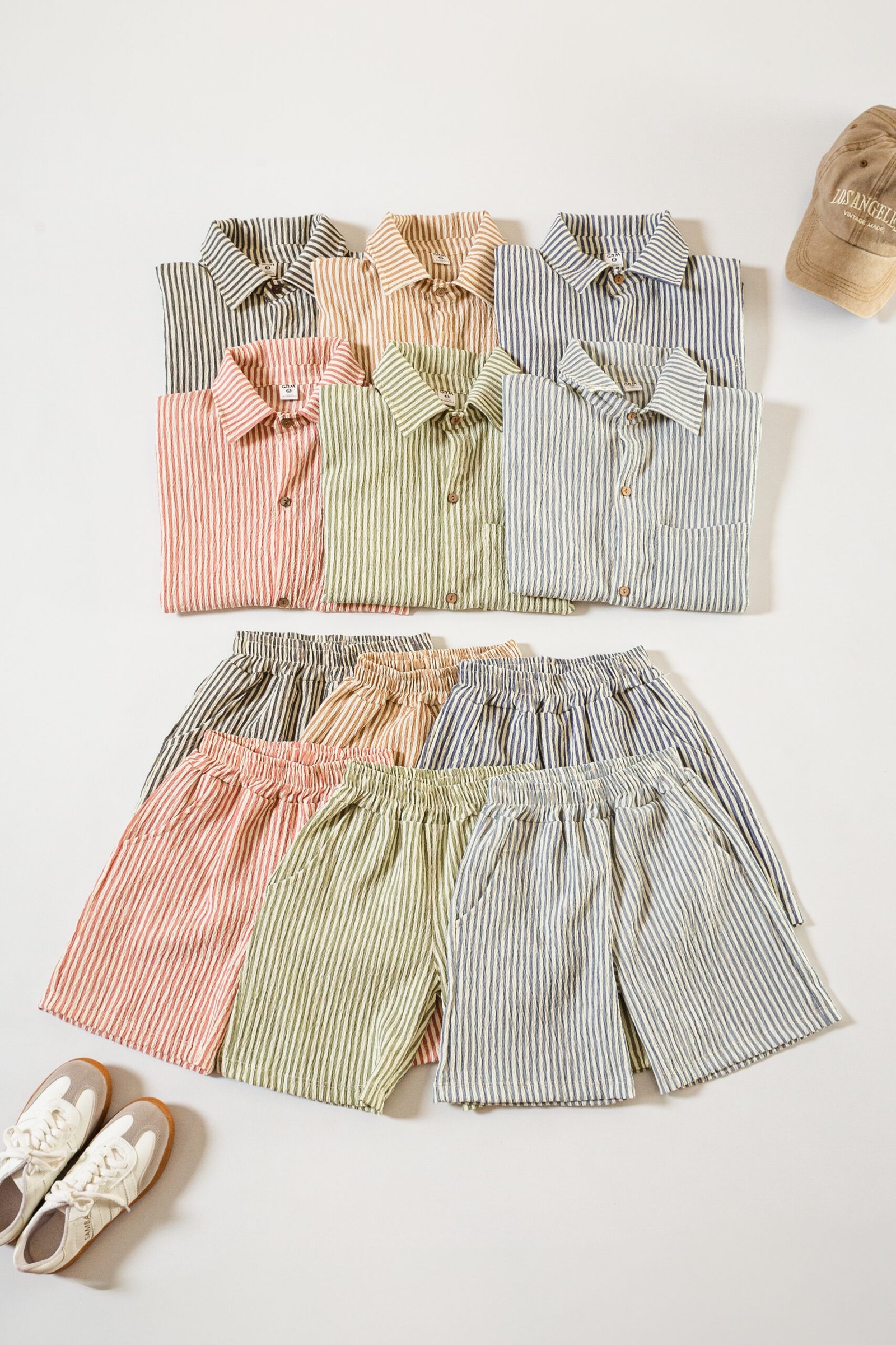 Conjunto de camisa oversize y short clásico, confeccionado en tela Bruselas estampada con diseño rayado. Una propuesta liviana, fresca y cómoda, ideal para los días de verano.